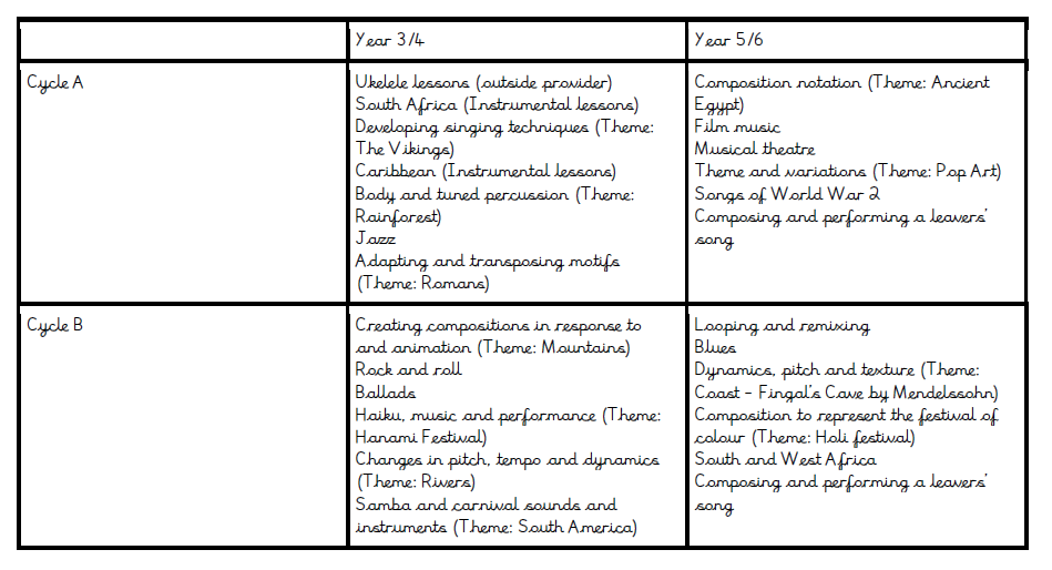 The children will actively participate in musical activities from a range of styles and traditions, developing their musical skills and their understanding of how music works. Lessons involve a range of different approaches from independent tasks, paired and group work, as well as improvisation and teacher-led performances. The lessons are differentiated so that every lesson can be accessed by all pupils. Children are taught key facts and vocabulary about each unit of work so that they can evaluate it, and understand how it is made, played, appreciated and analysed.