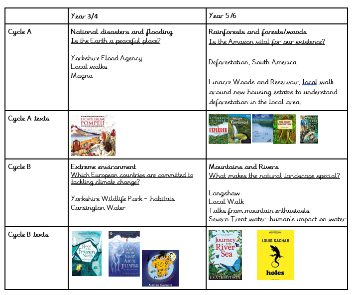Each lesson builds on previous learning using a range of resources; from videos and songs to photographs, books and maps/atlases. Where possible, children will have the opportunity to go on a visit linked to the topic to further enhance their learning, or visitors come into school to share their knowledge. Visits to the local area and using the school grounds are also encouraged to support the children’s learning.